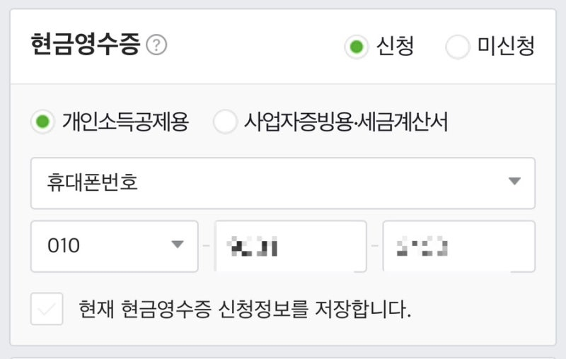 2. 결제 페이지 아래에 있는 현금영수증 신청하기에 체크를 합니다.